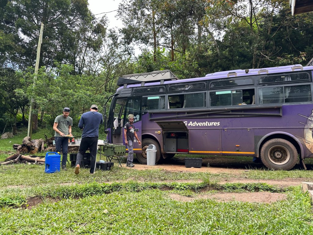 We survived the night in the conference room. Today we enjoyed a chimpanzee tracking excursion through the scenic Kalinzu Forest Reserve. We followed forest trails, which offered amazing views over the Rwenzori Mountains, Lake Edward, the Kazinga Channel, and the Congo. Then it was back in the old leaking bus for a few hours drive to our next accomodation – Leopard Rest Camp. We arrived in the afternoon and enjoyed some drinks together as a grou, soaking up the afternoon sun on the balcony bar.